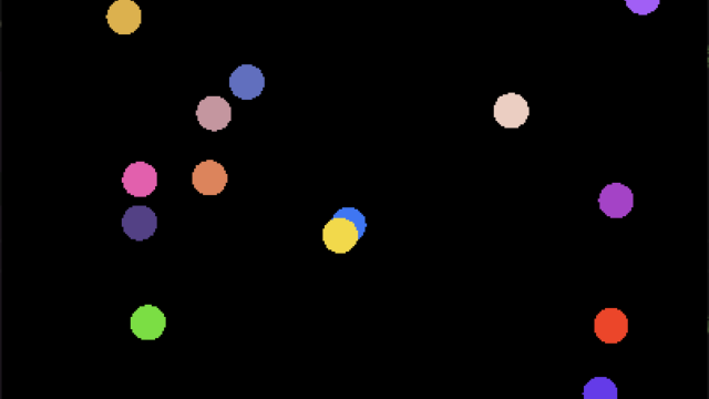 静止した円を上方に整列させ、下方からの動く円がぶつかったら消える動く円は反射ベクトルに従って跳ね返る...